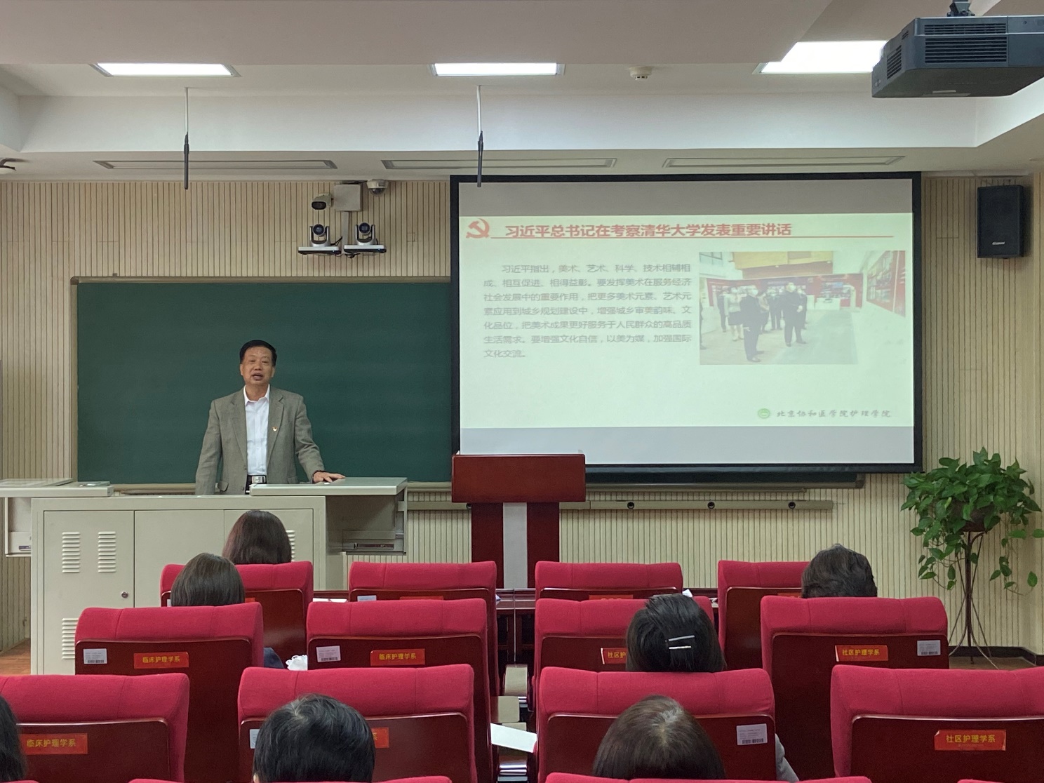 李峥院长随后结合自身经历谈了学习感受,并对学院教师工作提出几点希望。李院长谈到:习总书记指出,美术、艺术、科学、技术相辅相成、相互促进、相得益彰。做为教师应认真思考如何将美学融入校园文化,课堂教学。要将总书记指示精神和自身工作相结合,和护理专业相结合,反思如何构建中国特色、中国风格、中国气派的学科体系、话语体系、专业学位学科方向。高校要不断提高人才培养质量,学院要抓好质量、工程创新工程,培养高质量人才,培养高质量学生。教师应注意提高自身水平,做到自律、自强、自信,成为学生的榜样。希望全体教职工认真学习习总书记本次重要讲话精神,并通过学习提高对护理高等教育和办学的认识。