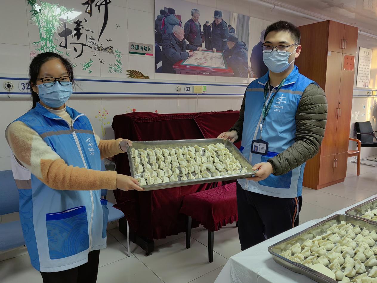 随后,大家围聚一团开始包饺子。老人们和舞蹈队阿姨们主动向同学们传授包饺子的技巧,盈盈笑语间更显温馨和谐。这个环节不仅能够增强老人的体验感,还可以让他们在动手操作中增添节日的乐趣。最后,大家一起为老人们送上冬至的祝福和问候。志愿者通过亲切地交谈,了解他们的生活状况,并祝愿他们身体健康、生活幸福。
