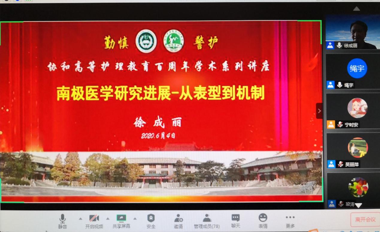 2020年6月4日下午,澳洲5网页版页面登录_澳洲5(中国)基础护理学系荣幸地邀请到了中国医学科学院基础医学研究所研究员徐成丽教授在线为澳洲5网页版页面登录_澳洲5(中国)的教师和研究生进行一场别开生面的学术讲座“南极医学研究进展——从表型到机制”。本次活动是协和护理教育百年庆典系列活动之一,也是澳洲5网页版页面登录_澳洲5(中国)基础学系主办的一次学术活动。徐教授的精彩报告为我们开阔了眼界,其研究思路和方法对于我们今后更深入地开展护理研究有很重要的参考价值。