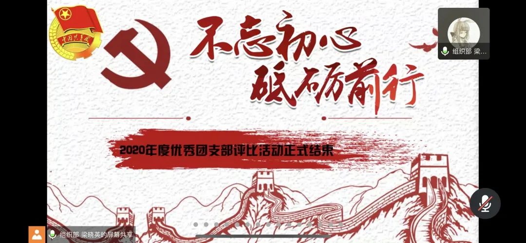 本次活动采取线上汇报方式,各团支部对2019年5月~2020年4月支部发展情况进行了精彩的演讲,展示了过去一年中大家丰富多彩的支部活动,以及一年来团支部取得的成果。各团支部汇报结束后,各支部通过提问的方式,相互交流学习。提问环节结束后,评委在微信群进行打分。在会议进行过程中,组织部干事全程录屏,对精彩瞬间进行了截屏记录。