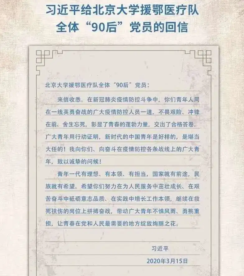 3月15日,习近平总书记给北京大学援鄂医疗队全体“90后”党员回信,向他们和奋战疫情防控战线上的广大青年致以诚挚问候,肯定了新时代青年的担当奉献。