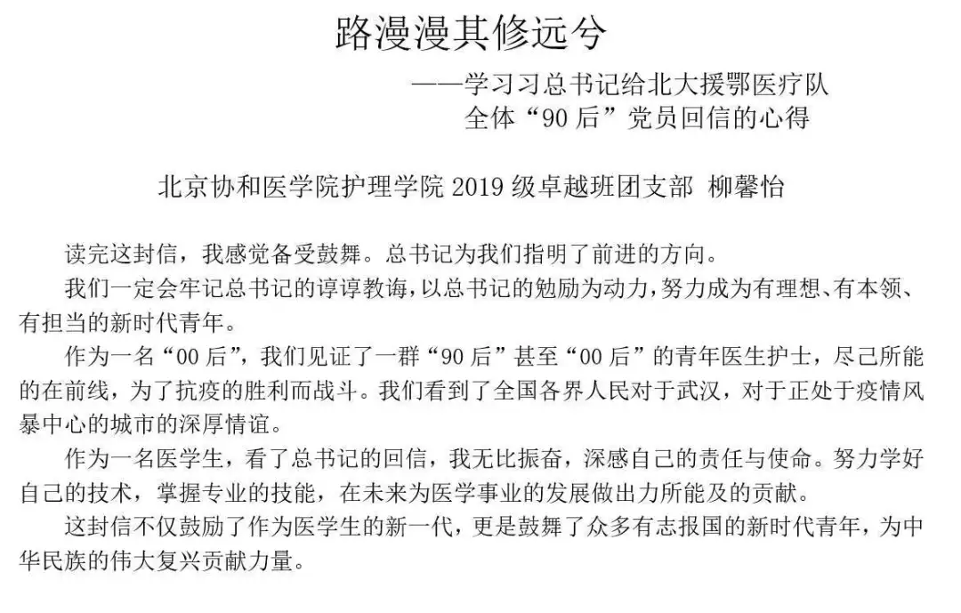 习近平总书记给北京大学援鄂医疗队全体“90”后党员的重要回信,于90后的我们而言,深受鼓舞。我们理应珍惜现在时光,认真学习,夯实基础、加强专业发展,为以后临床一线的工作,抑或重大公共卫生事件的一线前沿做好基础、做好准备。作为党员,义不容辞,作为团员也应该奋求进步。同时非常感谢习近平总书记对90后的鼓舞,我们定当彰显青春的蓬勃力量,愿新冠疫情早日结束!