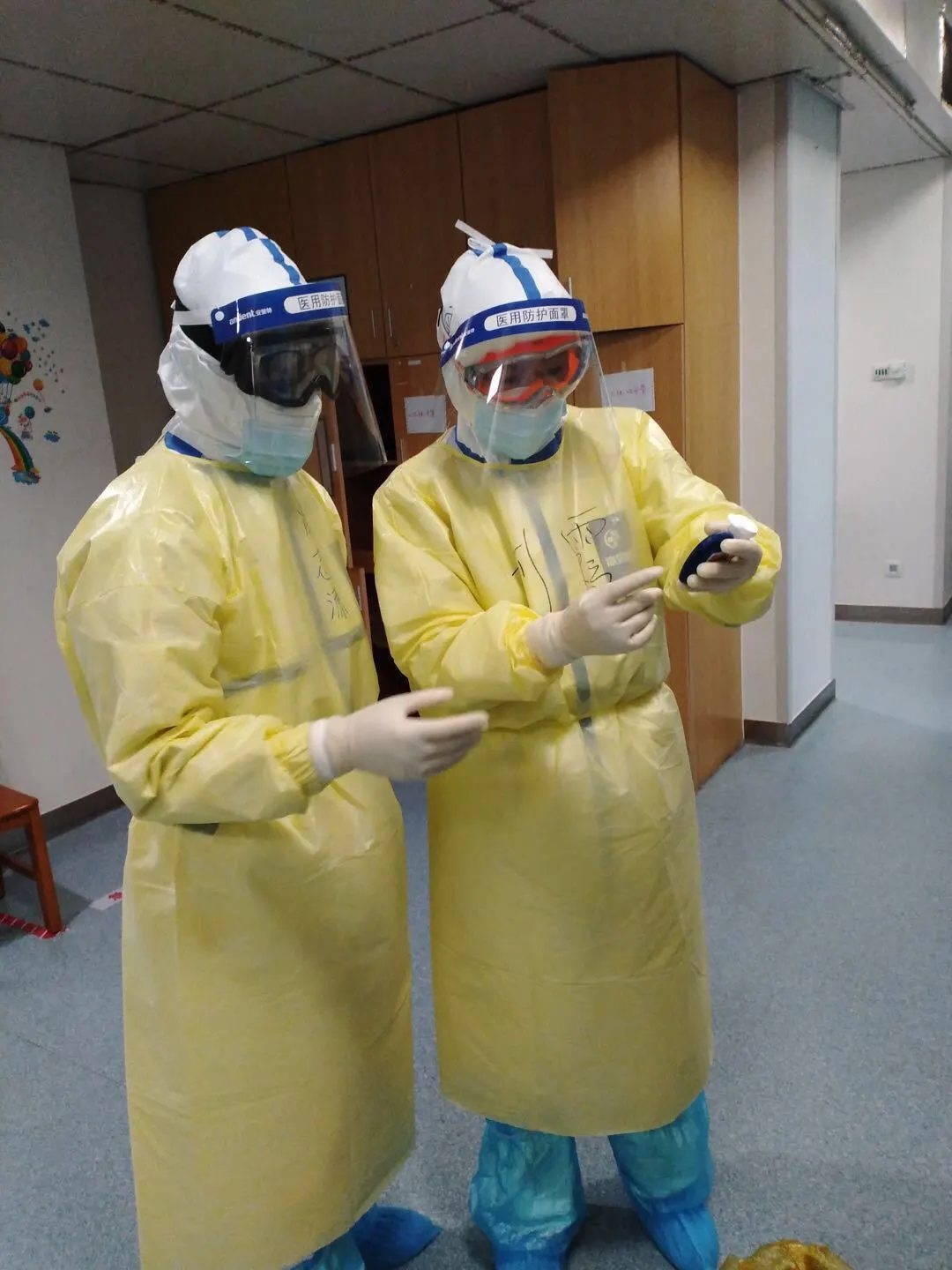 到武汉当天夜里按要求我们就要进病房上班,晚上进行了紧急防护服穿脱强化培训。我们护理专业组(ICU三组)是夜里2点起床,乘3点的车去医院。这个紧张的节奏让人感觉一下子进入战时状态。北京协和医院医疗队独立承接了同济医院中法新区的C9西重症病房。32张床位,几乎所有患者都是病危,将近全部患者都处于插管上机状态。因为没有重症监护轮转经验,第一天我的感觉就是困、累、乏加懵晕,尤其是穿上防护服+隔离衣后顿时感觉呼吸困难。我们医疗队充分考虑了队员可能发生不适应的情况,将全部护理人员分成7个护理小组,每组人员在污染区工作4个小时后由后一组接替。专业组组长由第一批的人员担任,因为他们已经在病区工作了半个月,熟悉了工作流程。我们每组组员16人,根据病房情况分成前组后组,每大组再细分成几个分组,3~4个队员中由一个ICU的护士作“头儿”率领着“未轮转过ICU的新手”一起开展工作。