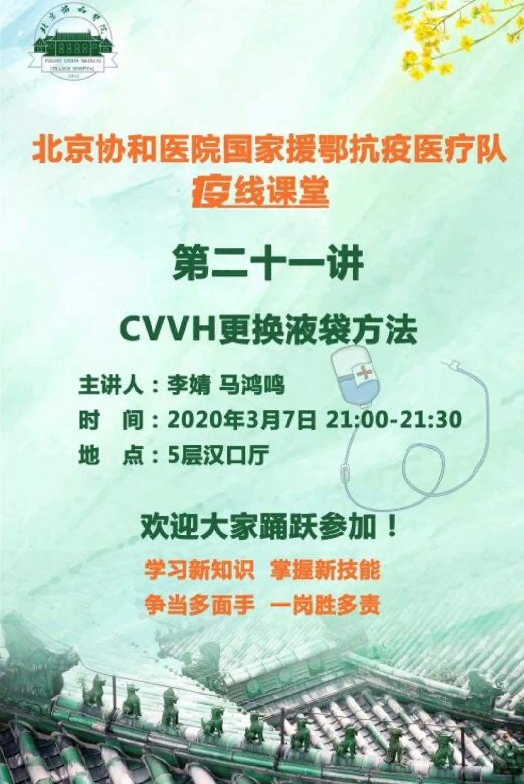 为了加强夯实我们的理论基础,提高医疗队员的综合能力,进一步提升整体战斗力,降低患者病亡率。从2月16日开始,我们医疗队举办了疫线课堂。每天一个主题,晚上九点开讲,一般30分钟左右。从感染内科主任李太生教授带来首讲“新型冠状病毒肺炎重症、危重症病例诊疗方案”开始,至今已经举办23讲。主题紧密围绕目前的临床工作,丰富又实用,既有诊疗规范,又有护理操作指南,还有医学伦理的探讨。课堂形式也很活泼,有传统讲座、讨论,还有工作坊。这个疫线课堂,非常及时,作用凸显。因为讲的内容都是我们每天面临的工作内容,解决的是我们常见的问题和疑惑。所以学习时大家兴趣盎然。因为时间和工作原因,听不到现场授课的晚上两个班次的队员们还会深感遗憾。按照带队领导张抒扬书记的话说,就是让我们能通过疫线课堂补充新知识、掌握新技能,争当多面手,一岗胜多责。这段时间深感疫线课堂拓展了我的理论知识宽度,同时提升了我的专业能力,提高了我的ICU临床工作水平。
