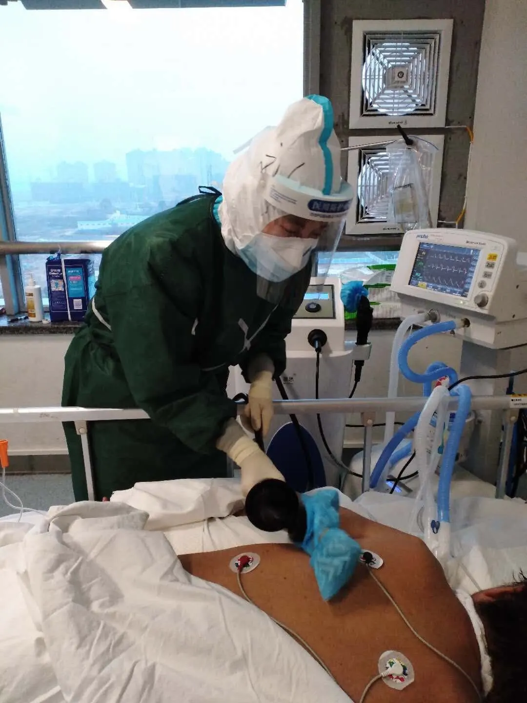 正如前面所述经过临阵磨枪,边干边学,边学边干,思悟前行,我们大约在一周后适应了在这的工作节奏,两周后进病房毫无压力。因为除了我们有一心救治病人的决心,这时候工作也走上了正轨。病房各种规章制度、工作流程越来越完善,医护配合、护护配合越来越默契,工作越来越细致,关注院感、预防压疮、血栓等并发症等工作系统推进。接班后独自系统认真地查看呼吸机管路及参数,查看胃管、尿管各种引流管路、观察各种动静脉管路是否通畅、有无渗血,了解鼻饲等治疗情况,查看皮肤是否完整。熟练地检查呼吸机气囊压力、处理冷凝水,振肺排痰后定时吸痰。慢慢地,用心尽力,笃学践行,在各位领导、医生护士同事们的帮助下,顺利过渡到ICU护士角色。