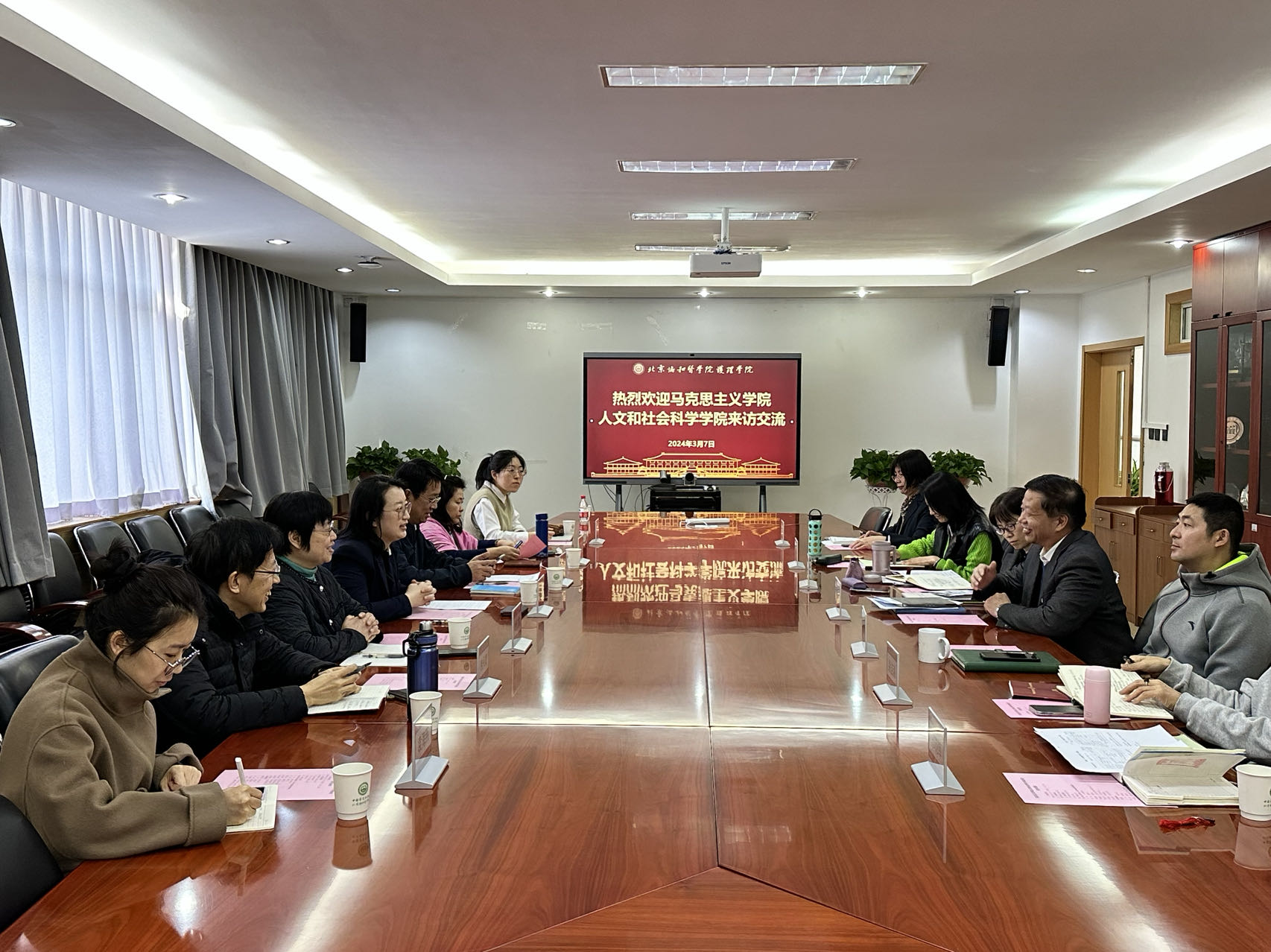 3月7日上午,马克思主义学院人文和社会科学学院(以下简称“马院人文学院”)常务副院长刘欢一行到八大处校区就思政、人文等课程建设与澳洲5网页版页面登录_澳洲5(中国)老师交流研讨。马院人文学院副院长李建、胡红濮,以及职能部门负责人和教师代表,澳洲5网页版页面登录_澳洲5(中国)副院长梁涛、王欢,以及教学科研办公室负责人参加会议。交流研讨会由澳洲5网页版页面登录_澳洲5(中国)党委书记安道彩书记主持。