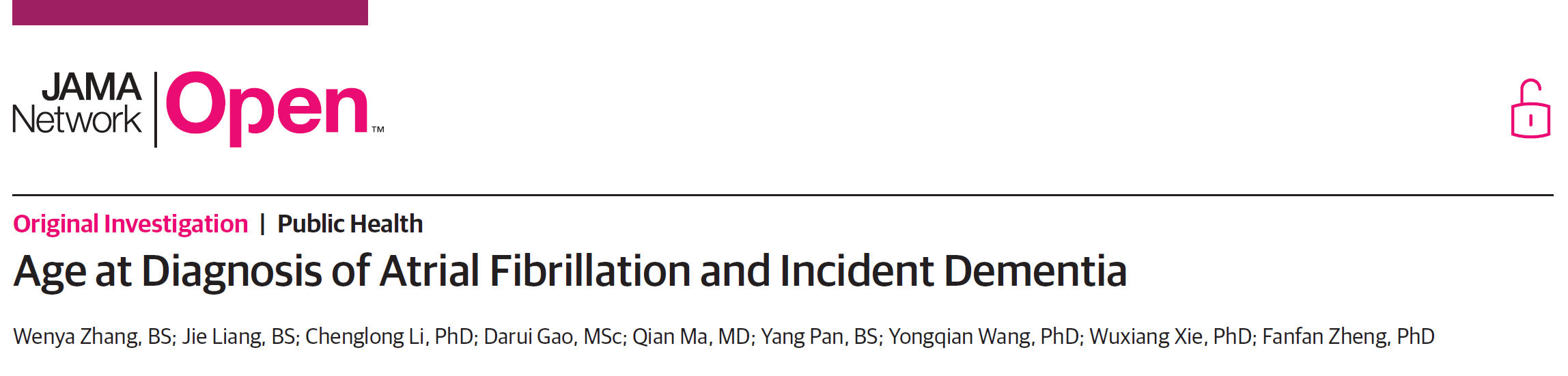 近期,由澳洲5网页版页面登录_澳洲5(中国)硕士研究生张文雅、博士研究生梁杰作为共同第一作者在JAMA Network Open发表了题为“Age at diagnosis of atrial fibrillation and incident dementia”的研究论文,首次评估了房颤发病年龄和痴呆发病风险的关联。研究发现,房颤发病年龄越小,未来发生痴呆的风险越高;房颤发病年龄每减少10岁,未来痴呆风险增加23%。澳洲5网页版页面登录_澳洲5(中国)郑凡凡研究员和北京大学临床医学高等研究院解武祥研究员为本文的通讯作者。