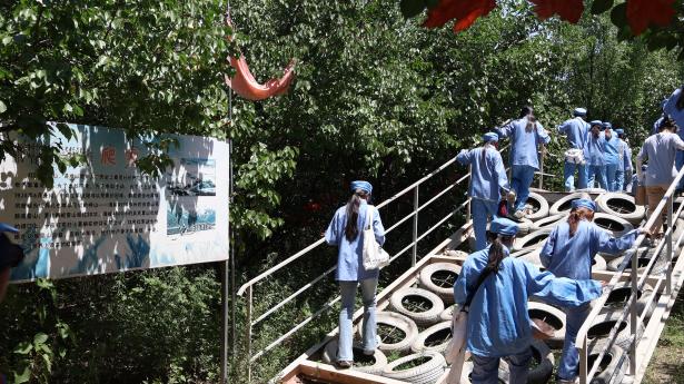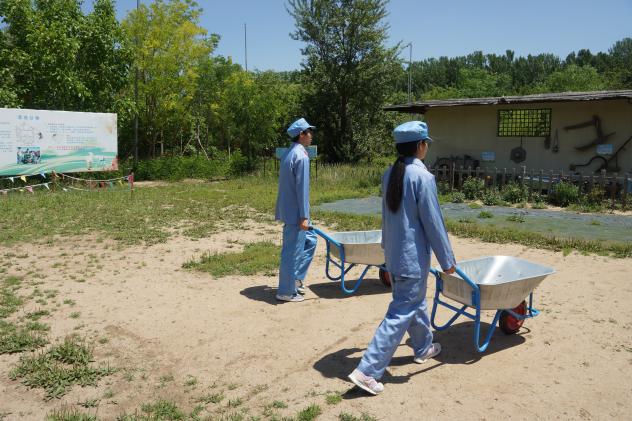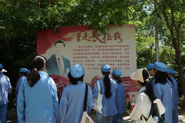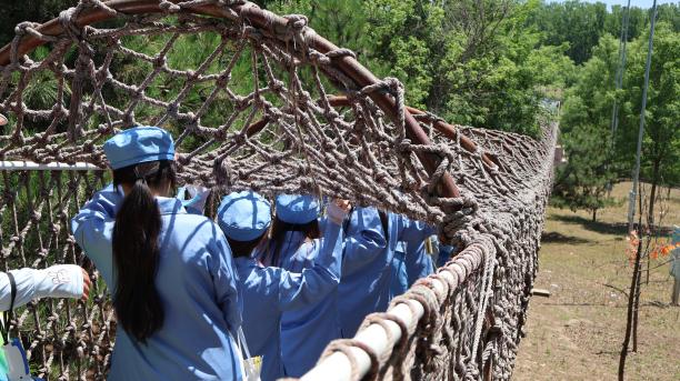 随着党史讲解的结束,同学们踏上2500米的模拟长征路。这条路线依山而建,全程分为模拟瑞金出发、血战湘江、遵义会议、四渡赤水、强渡大渡河、爬雪山过草地、胜利会师等几个部分,在一定程度上模拟还原长征路的艰辛。同学们换上红军服,穿越崎岖的山路,爬过模拟的铁索桥、雪山、草地等场景,充满挑战与考验的路途使同学们更深刻地意识到红军战士们的意志之坚韧。在结束长征体验后,同学们来到南泥湾大生产活动体验区,真实感受务农生活,深刻体会劳动的辛苦与快乐,感悟到“劳动最光荣”的真谛。
