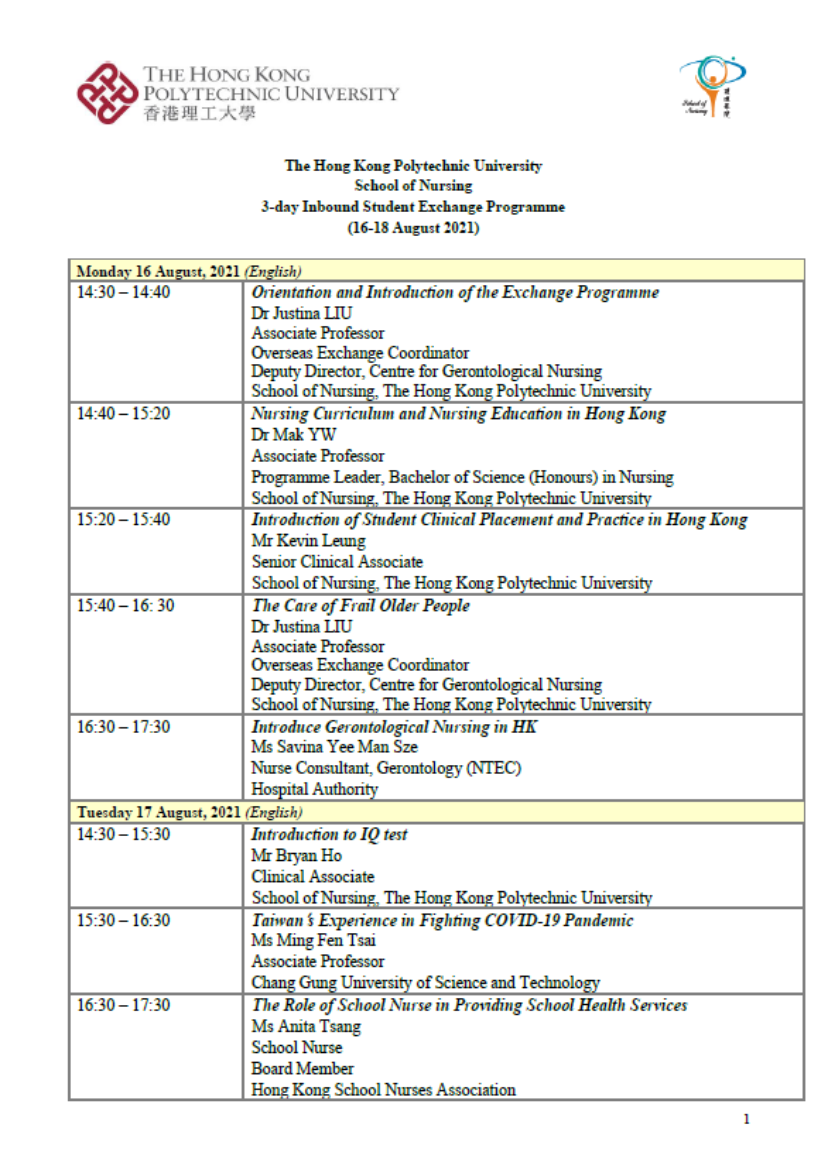 介绍香港理工大学护理课程及实习情况;分享护理知识及各地区临床护理情况 |