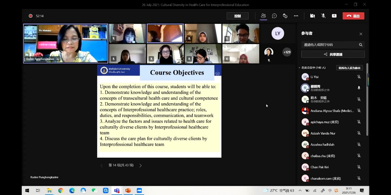 北京时间2021年9月10日晚20:00-22:00,受泰国清迈大学邀请,我校师生(共44人,其中8名教师,36名19级本科生)参加了由清迈大学主办、美国德克萨斯大学健康科学中心圣安东尼奥分校协办的线上国际交流会议,本次会议主题为“Lessons Learned and Work Opportunities during the Covid-19 Pandemic”。